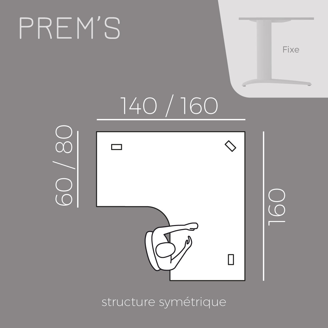 Bureau compact 90° symétrique retour 80cm de L160 cm. Structure poutre symétrique. PREM’S
